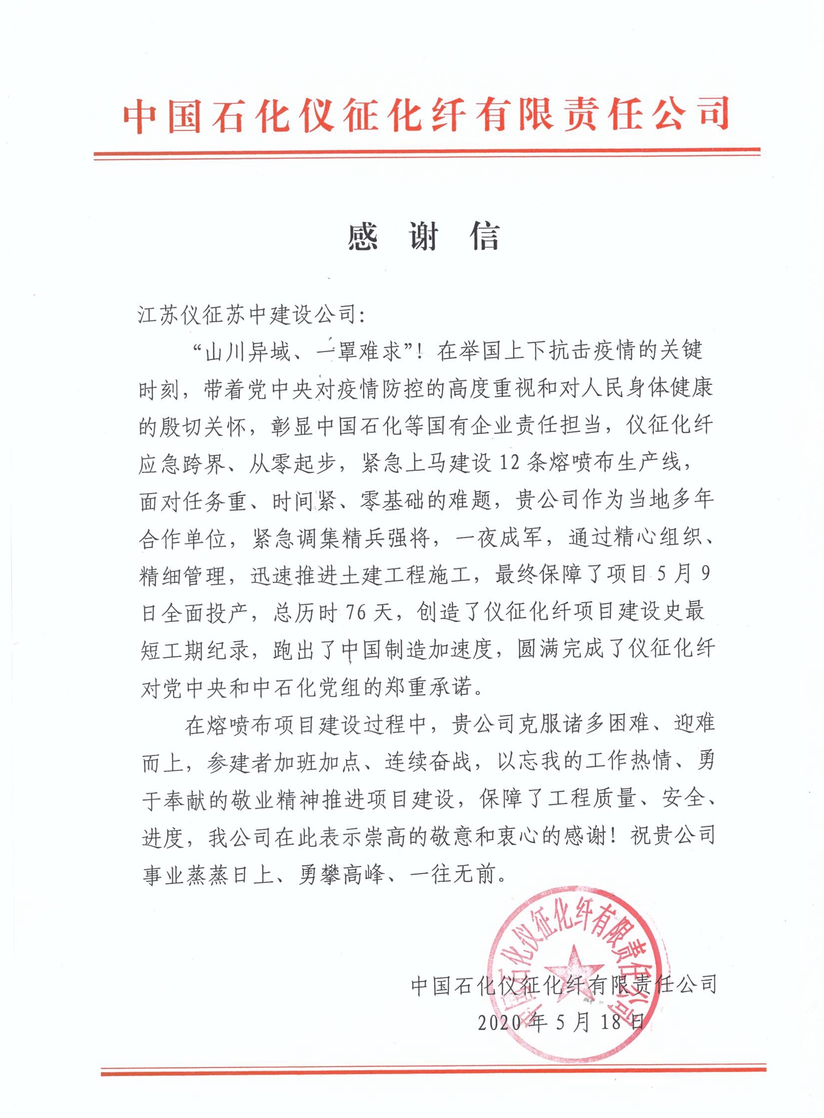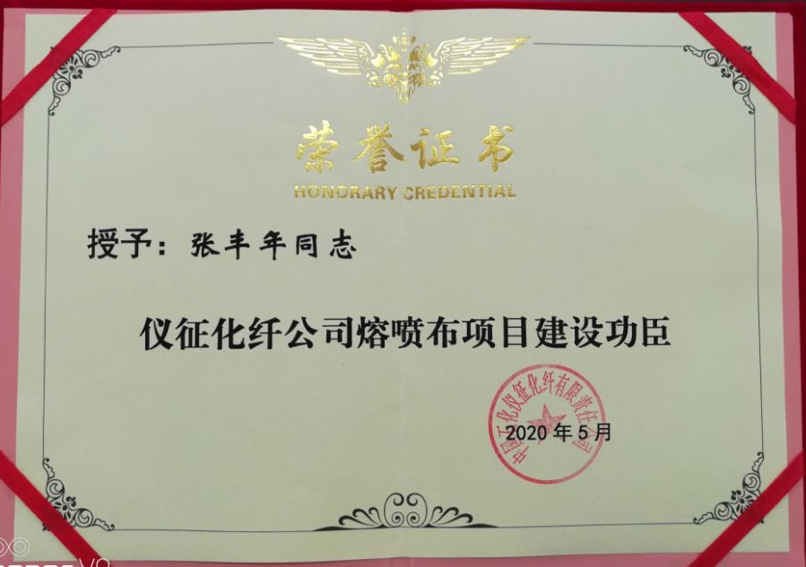 一夜成軍,熔噴布項目創(chuàng)儀化項目建設(shè)史最短工期記錄。為表彰我公司在熔噴布項目建設(shè)中的突出表現(xiàn),中國石化儀征化纖有限責任公司于2020年5月18日向我公司發(fā)來《感謝信》,同時向項目經(jīng)理張豐年同志頒發(fā)“熔噴布項目建設(shè)功臣”榮譽證書和獎?wù)录蔼劷?/span>5000元整。